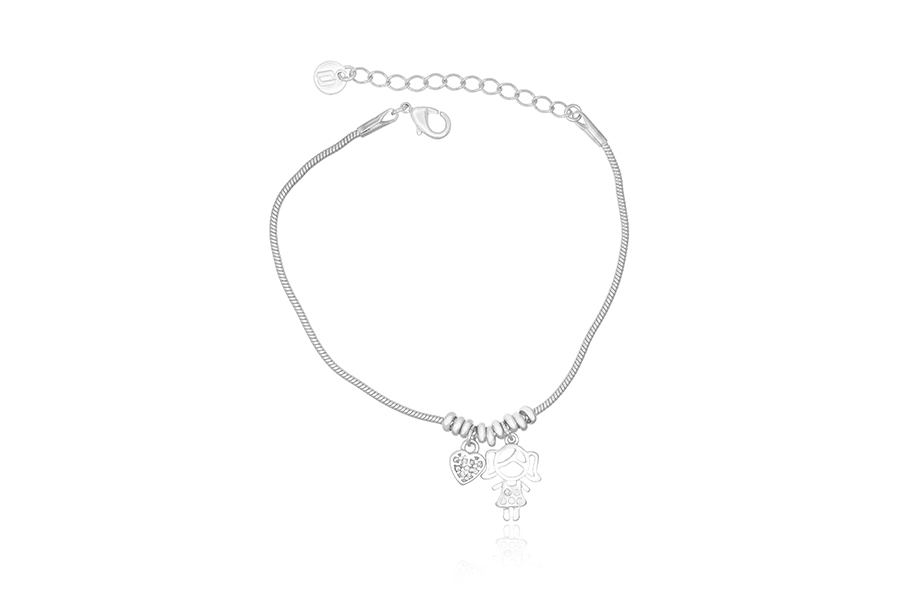 PULSEIRA BANHADA EM PRATA LEVE, RABO DE RATO 1,40mm ESPESSURA, MENINA E CORAÇÃO