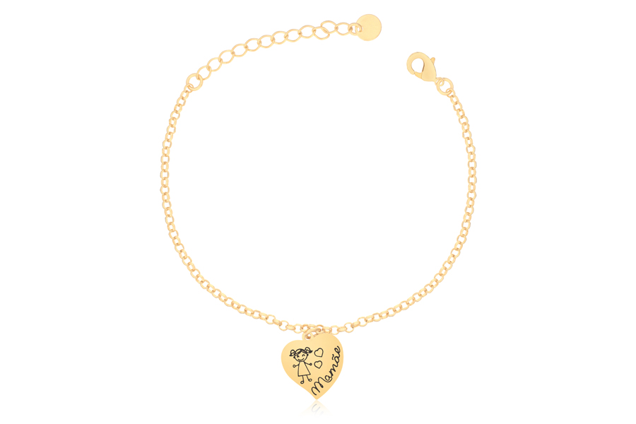 PULSEIRA BANHADA EM OURO, ELO PORTUGUÊS 2,50mm, 17cm COMPRIMENTO, EXTENSOR 4cm E CORAÇÃO MAMÃE MENINA, 14mm LARGURA