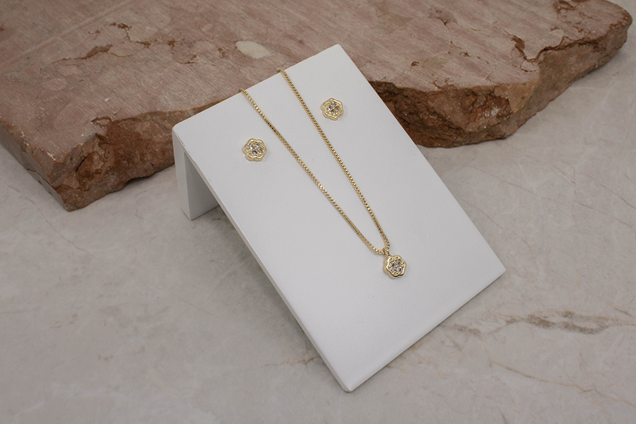 CONJUNTO BANHADO EM OURO, INFANTIL, GARGANTILHA VENEZIANA 0,80mm, 36cm COMPRIMENTO E FLOR 6mm LARGURA, BRINCO FLOR 6mm LARGURA