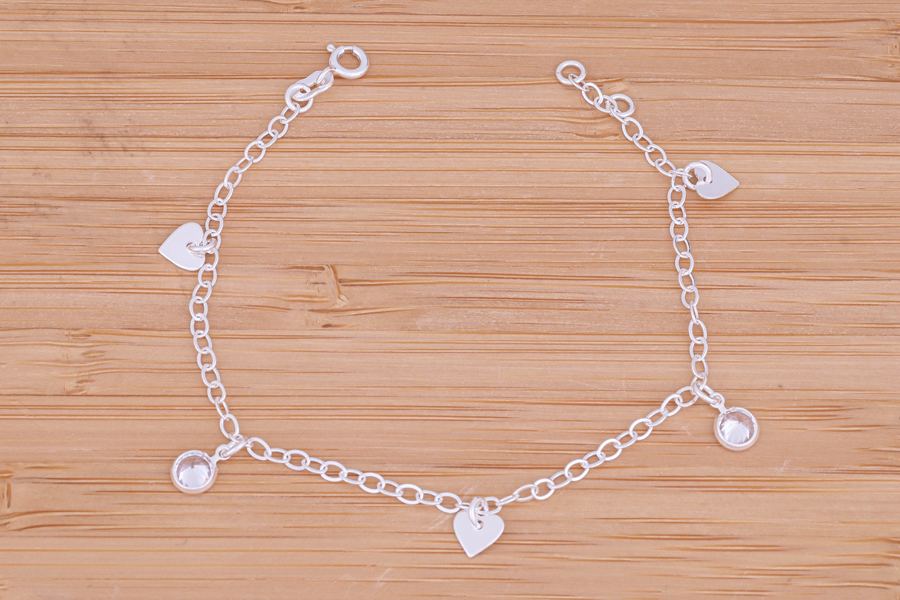 PULSEIRA EM PRATA, ZIRCÔNIAS REDONDAS COM CRAVAÇÃO INGLESA INTERCALADAS COM CORAÇÕES LISOS, ELO OVAL,18+1cm COMPRIMENTO